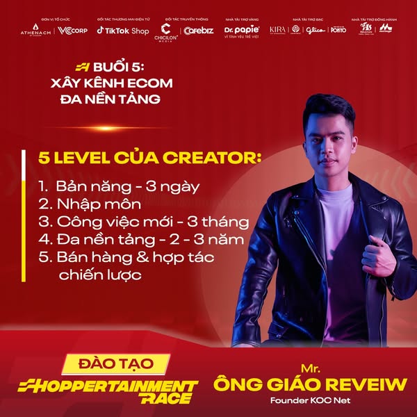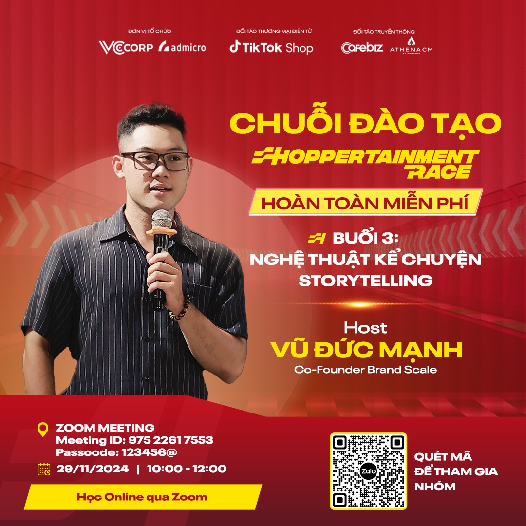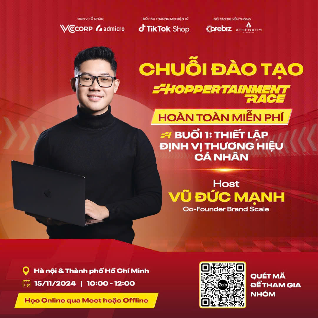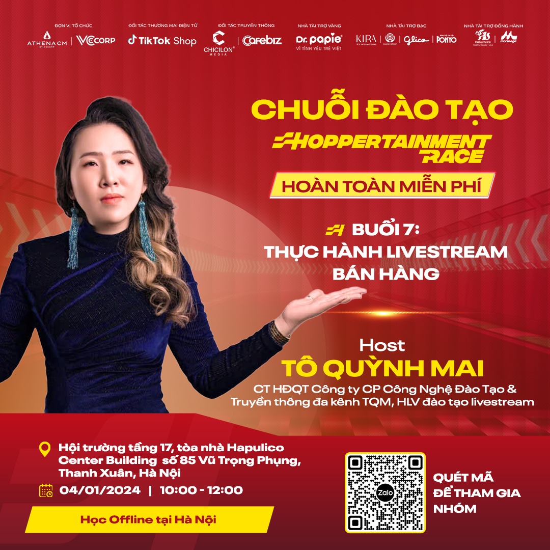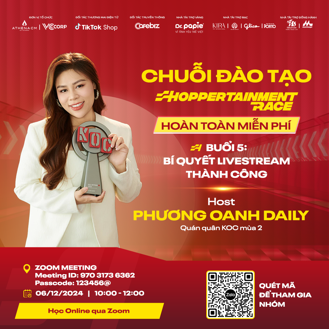 Đường đua Shoppertainment Race Festive Season 2024 càng thêm sôi động với sự đồng hành của các chuyên gia đào tạo nổi tiếng như Mạnh Vũ, Phương Oanh Daily, Tô Quỳnh Mai, Ông Giáo Review, Võ Thái Thảo và nhiều cái tên nổi bật khác. Những gương mặt đình đám này sẽ phát động, hướng dẫn và chia sẻ kinh nghiệm, giúp người chơi bứt phá trên "đường đua", mở rộng tiềm năng kinh doanh với chuỗi 8 buổi đào tạo.